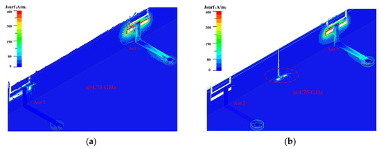 Surface current distributions when Ant 1 is excited. (a): Without decoupling structure and (b): with decoupling structure.