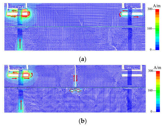 Surface vector current distributions. (a): Without decoupling structure and (b): with decoupling structure of Ant 1 and 2.