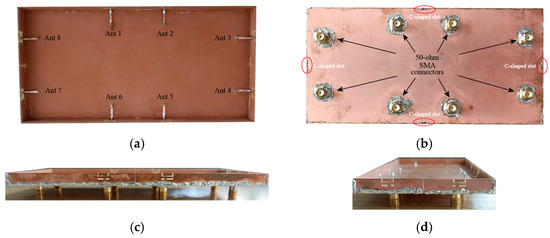A prototype of the MIMO antenna system was manufactured and tested, as shown in Figure 11, to verify the feasibility of the proposed 8-element MIMO antenna system. Metallic copper was attached to the bottom and side panels of the smartphone’s body made of RF-4. Microstrip feeders were printed on the top, as shown in Figure 11a. Moreover, the metal frame and the ground plane of the mainboard were welded together. Eight 50 Ω SMA connectors were soldered with the feeder for convenient antenna testing. The red circled part shown in Figure 11b is the etched C-shape decoupling slot. As shown in Figure 11c,d, the gap between the periphery of the frame and the bottom plate is welded to complete by solder. The S-parameter test results were obtained by the Agilent E5071C vector network measurement analyzer, as shown in Figure 12a. The far-field results were obtained by a SATIMO anechoic chamber, as shown in Figure 12b.