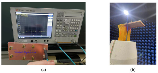 Photographs of the test site where the MIMO antenna was tested. (a): Vector network measurement analyzer and (b): SATIMO anechoic chamber.