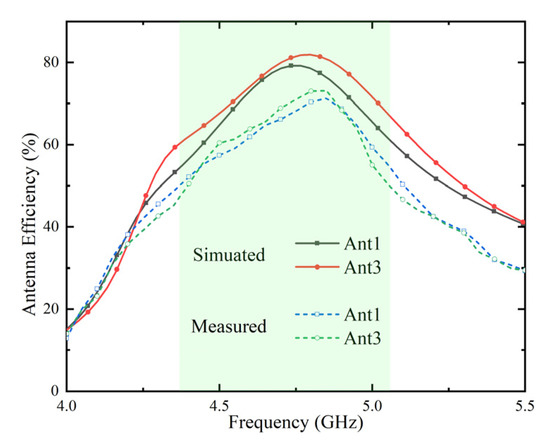 In Figure 14, the measured radiation efficiency of Ant 1 and Ant 3 is lower than the simulated result in the frequency band, and the peak of the center frequency is also slightly lower than the simulated value. This is due to the fact that during the test, in addition to manufacturing tolerances, the placement of the antenna system can also cause the loss of tangent of the FR-4 substrate to be non-uniform. However overall, the measured efficiencies of the Ant 1 and Ant 3 range from 50~73% (−3 dB~−1.37 dB) in the desired frequency band.