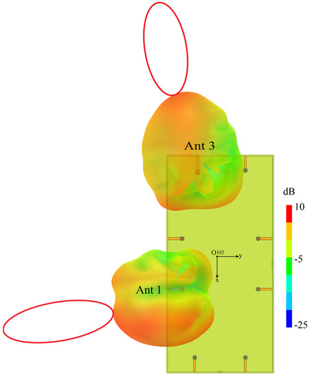 In this subsection, the radiation patterns of MIMO antenna systems were studied. Since the system is symmetrically arranged, for simplicity, only the 3-D radiation patterns of Ant 1 and Ant 3 were analyzed. The simulation results at 4.75 GHz are shown in Figure 16. Obviously, in the XY plane, the radiation patterns of Ant 1 and Ant 3 point to the negative y-axis direction and the negative x-axis direction, respectively, showing orthogonal characteristics. The maximum radiation directions do not point to each other, which is beneficial to spatial diversity. The ECC value below 0.049 is also obtained, while the isolation is improved.