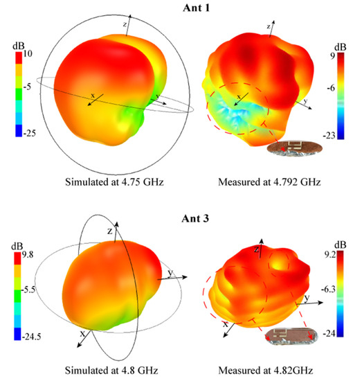 The simulated and measured 3-D radiation patterns of Ant 1 at 4.75 GHz and Ant 3 at 4.8 GHz are depicted in Figure 17, respectively. Obviously, the measured 3-D radiation pattern surfaces of Ant 1 and Ant 3 at the frequency points are not smooth. The reason is that the surface of the welding place is uneven to generate electrostatic effects, as shown in Figure 17 (the area pointed by the red dotted arrow). However, overall, Figure 17 shows the measured 3D radiation patterns agree well with the simulated ones.