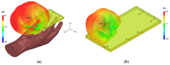 In Figure 18, the proposed MIMO antenna system is simulated with and without the user’s right-hand model. By comparing Figure 18a,b, it can be observed that human tissue forms a reflective surface so that the radiation of the entire antenna system is the largest in the direction away from the human body, while the radiation is relatively more minor in the direction close to the human body.