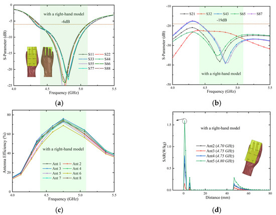 Simulation results of the proposed MIMO antenna with a right-hand model. (a): Reflection coefficients with a right-hand model, (b): transmission coefficients with a right-hand model, (c): total efficiency with a hand model, and (d): SAR with a right-hand model.