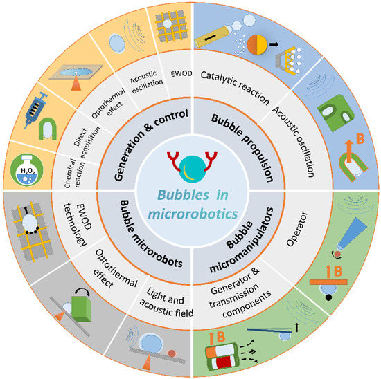In the micro/nano research field, bubble-based applications have attracted increasing attention because of their simplicity, controllability, and biocompatibility. They can be flexibly integrated with different microfluidic devices or microrobots. For example, in microfluidics, bubbles can be remotely excited by an acoustic field to act as micromixers [4,5], micropumps [6,7], or microvalves [8,9], and they can operate upon particles and cells [10,11]. In addition, in microrobotics, bubbles can act as the manipulating or transmission components of microrobots [12,13], and the bubbles themselves can act as microrobots [14]. However, the bubble generation methods and their applications in the microrobotics field (e.g., propulsion, micromanipulation, and microassembly) have not been classified and summarized in detail.