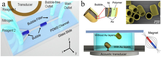 Bubbles are attractive, magical, multifunctional, and ubiquitous in industrial production and our daily life. They have a variety of physical properties including large specific surface area, low density, and surface hydrophobicity. Applications based on bubbles have received extensive attention and research in recent decades [1,2]. Depending on their sizes, bubbles can be categorized into macrobubbles, microbubbles, and nanobubbles. Macrobubbles are 2–5 mm in diameter. At the microscopic scale, bubbles can be classified into microbubbles (diameters of 1–100 μm) and nanobubbles (diameters below 1 μm) [3]. Following the development of microfluidics and microrobotics in recent years, micro/nanoscale bubbles have been seen as an emerging tool for solving numerous challenges in various lab-on-a-chip (LOC) applications, and they are gaining increasing attention from researchers.