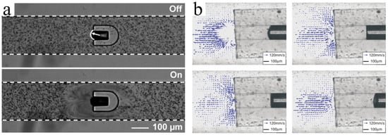 where and are the lengths of the liquid in the tube and the bubble column, respectively. Acoustically vibrating bubbles usually exhibit two typical oscillation modes: (1) volumetric or (2) reciprocal along the axis [61,62]. Under the excitation of acoustic waves, the particles close to the bubbles are primarily affected by the acoustic streaming force (estimated by Stokes drag force), that is, the viscous resistance caused by the streamline direction of the micro flow field, and the secondary acoustic radiation force (also known as the Bjerknes force) caused by the scattering effect of the bubble on the incident acoustic wave. The dominant force can be calculated by the ratio of magnitudes [63,64,65]. Acoustic bubbles can not only be used to manipulate particles, cells, and other objects but also to manipulate fluid flows within microfluidic devices. For example, Ahmed et al. reported that using ultrasound to oscillate bubbles trapped in a “horse-shoe” structure inside microtubules could affect fluid flow (Figure 5a) [66]. Under the action of acoustic waves, the contact surface between the microbubbles and surrounding liquid vibrates, which triggers microstreaming [67,68]. In addition, medical microbubble contrast agents driven by ultrasonic pulse can be used for treatment delivery and monitoring [69].