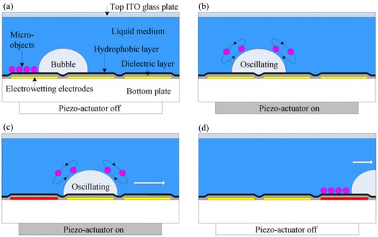 Oscillating bubble micromanipulation process driven by EWOD technology and acoustic waves. (a–d) Capturing, carrying, and releasing of objects via an oscillating mobile bubble. Adapted from Chung et al. [74] with permission from the Institute of Physics Publishing, Copyright 2012.