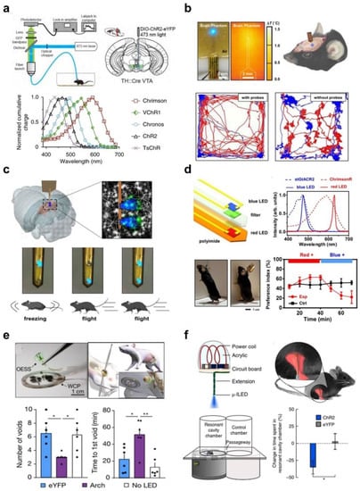 - Zhao, Y.; Liu, C. Wirelessly Operated, Implantable Optoelectronic Probes for Optogenetics in Freely Moving Animals. IEEE Trans. Electron Devices 2019, 66, 785–792. [Google Scholar] [CrossRef]
