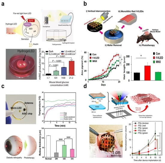 As implantable light source probes are an efficient method of delivering light to deep tissues, light therapy with such a design is also attractive thanks to its stable and sufficient light energy and is critical for treating target lesions in vivo. Figure 3a depicts wirelessly powered LEDs implanted in diabetic mice, in which the 730 nm light activates photoreceptors (monophosphate synthase) and triggers insulin gene expression to rapidly restore steady-state blood glucose levels in freely moving mice [82]. To design custom receiver electronics compatible with external smart devices, the system customizes an implant structure called “HydrogeLED”, which incorporates engineered cells carrying alginate saline gel as well as wireless power coils and LEDs into a 15 mm spiral cylinder. This smart device further incorporates a blood glucose monitor, enabling semi-automatic blood glucose-dependent regulation via a wireless power transmitter that controls the LED lighting intensity and duration. This capability is demonstrated in diabetic mice implanted with the device, where the luminescent power of the LED is controlled in real-time to release different concentrations of insulin as the blood glucose concentration changes.