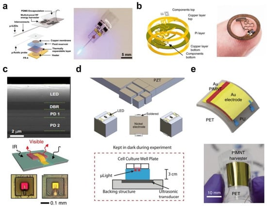 As depicted in Figure 5c, a thin-film microscale device achieves upconversion from near-infrared (~810 nm) to visible light (630 nm (red) or 590 nm (yellow)). The encapsulated microscale device can be implanted in the subcutaneous tissue and provides stable, long-term implantable light sources in behavioral animals [25]. Because near-infrared light penetrates biological tissues to a certain depth, photovoltaic cells also can absorb photons and provide solar energy to power the system. With the aid of advanced fabrication techniques, it is possible to fabricate ultra-small implantable devices with high spatial resolution and achieve high integration with implantable devices [22,76]. The ultrasonic energy transfer method shown in Figure 5d can also achieve a long-distance energy supply, in which the ultra-small device integrates a microscale LED into a piezoelectric crystal and can receive ultrasonic waves to generate energy to drive the LED for photodynamic therapy [9]. However, slight misalignment between the transducer and the implanted receiver reduces the coupling efficiency significantly. Additionally, the ultrasound sound generator must be in contact with the skin in order to reduce impedance mismatch at the tissue-air interface and keep the ultrasound path away from the bone region [98]. As shown in Figure 5e, a flexible piezoelectric device is able to flex and generate pulses of electricity to stimulate the motor cortex of mice, acting as a self-powered device for deep brain stimulation [99]. The piezoelectric effect that converts mechanical energy to electrical energy is a highly efficient and attractive method for self-powering without the requirement of external excitation. In order to generate sufficient power to satisfy the operation of the circuits, it is necessary to design complex circuits and develop high-performance piezoelectric materials, which are also incompatible with static conditions [100,101].