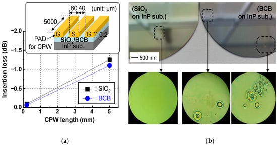 Implementation results of coplanar waveguides (CPWs) with different dielectric layers of SiO2 and BCB: (a) measured insertion loss of fabricated SiO2- and BCB-based coplanar waveguide (CPW) lines. The inset shows a structural diagram of the fabricated CPW lines; (b) microscope images immediately after deposition of SiO2 and BCB layers on InP substrates.