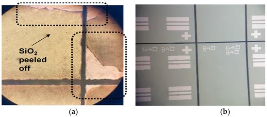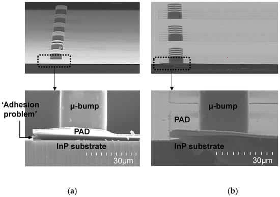 The process for the formation of the PAD metal was conducted on both SiO2-deposited InP and SiC substrates, as shown in Figure 2b. The process methodology of the evaporation and lift-off was first applied and the detailed process flow was as follows: A cleaning process was conducted using acetone/IPA/DI solutions. A photolithography process with a critical dimension (CD) of 60 μm and an undercut slope was performed using an NR93000PY negative photoresist (PR) and EVG640 contact aligner. The Ti/Au PAD metal with a thickness of 400/8000 Å was evaporated using the KVET-C500200 evaporator. A Ti/Au PAD metal pattern was formed by performing a lift-off process using an acetone solution. This evaporation and lift-off process methodology resulted in an adhesion problem between the PAD metals and the substrates, as shown in Figure 4a. To solve the problem, the process methodology of the sputtering and metal etching was finally applied, and the detailed process flow was as follows: The cleaning process was conducted as aforementioned. The Ti/Au PAD metal with a thickness of 400/8000 Å was then sputtered using sputter equipment with a predeposition of 10 s, bias power of 700 W, and operating pressure of 10−6 Torr. A photolithography process with the same CD of 60 μm was then performed using a positive AZ601 PR and EVG640 contact aligner equipment. The Ti/Au metal was then selectively wet-etched by immersing it in Ti and Au etchants for 50 and 30 s, respectively. The positive PR was removed with acetone-IPA-DI solutions. The PAD metal formed with the sputtering and metal etch process did not have any adhesion problems with the underlying substrate, as shown in Figure 4b.
