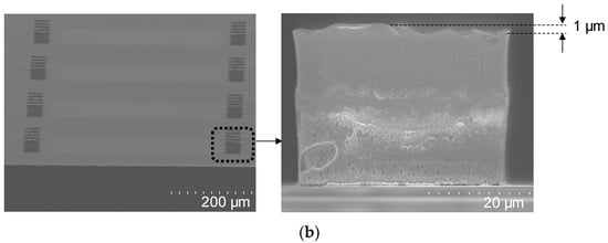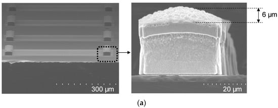 The process for the formation of the μ-bump metal was performed on a SiC-substrate-based sample, as seen in the conceptual diagram in Figure 2c. First, a 300/2000 Å thick Ti/Au seed metal was deposited using the aforementioned sputtering equipment, and then a photolithography process for electroplating (EP) was performed using a negative JSR-126N PR, a contact aligner, and a hard-bake process (110 °C for 8 min), leading to a PR thickness of 30 μm or more. An EP process was then conducted, wherein Cu, Ni, and SnAg metals were sequentially deposited to form μ-bumps with a height of 20 μm or more. The thickness of Ni and SnAg metals was set to be more than 2 μm and 6 μm, respectively. The PR and seed metal were then removed by immersing in an STR2000 solution for 30 min at 40 °C and in Ti/Au etchants for a total of 80 s, respectively. It was paramount for the bump to have a flat-top shape to achieve a high-yield performance of the flip-chip bonding. In the EP process of the Cu metal, a copper sulfate solution and additives are generally used. According to our experimental results, when the additives were mixed with the copper sulfate solution, the μ-bump had a convex top shape with a height difference from the top center to the top edge of approximately 6 μm, as shown in Figure 5a, leading to bonding failure. Accordingly, the additives were not used in the Cu EP process to obtain a flat-top shape, as shown in Figure 5b. The copper sulfate solution was provided by ATOTECH.