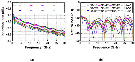 By utilizing the flip-chip μ-bump bonding technology, InP-to-SiC CPW lines where both PAD metals on the InP and SiC substrates were interconnected through μ-bumps were implemented. To pursue the scale-up of the bonding technology for mmW application, an InP-to-SiC CPW line consisted of ten daisy chains interconnected by a hundred μ-bumps, and its length was as high as 10 mm, as shown in Figure 8a. Ten InP-to-SiC CPW lines were arranged in a flip-chip-bonded sample with an area of 11 × 10 mm2, as shown in Figure 8b. Among ten CPW lines, the upper two lines and the lower two lines served as dummy patterns for achieving high-yield performance. Two identically designed flip-chip-bonded samples were fabricated. S-parameter data for all real CPW lines arranged in the two samples were measured using the N5225B PNA network analyzer (NA). Figure 9a,b show the measured results for the insertion and return losses of the CPW lines, respectively. The return loss was more than 15 dB over the frequency of 30 GHz from DC. The insertion loss was in the range of 2.24 to 2.71 dB at 30 GHz, and its average value was 0.25 dB/mm, which was comparable to the insertion loss values of previously reported conventional mmW CPW lines without any bonding technologies [,,]. The deviation of the insertion loss for the twelve CPW lines was within ±10%, which verified that the flip-chip-bonded μ-bump process between the InP-to-SiC substrates was well established, exhibiting good uniformity.