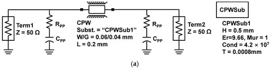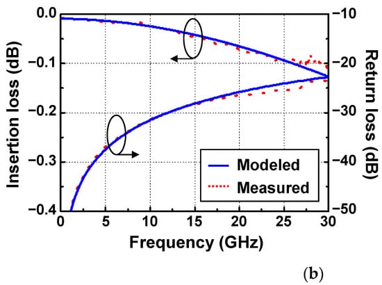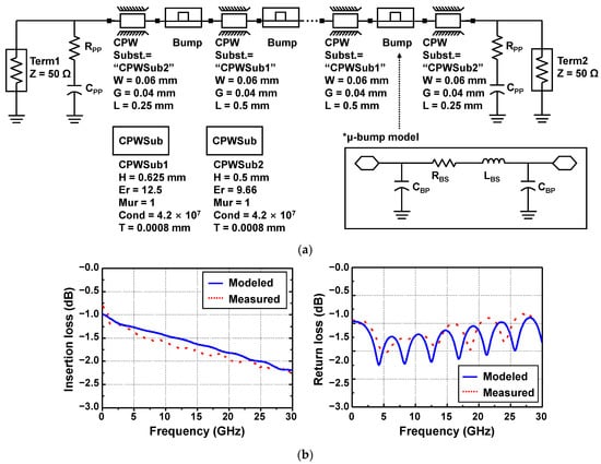 The RF modeling of fabricated μ-bumps was essential to utilize the flip-chip bonding technology for the mmW application. First, the RF pad region inserted for the RF measurement of CPW lines, as described in Figure 1a, was de-embedded using fabricated open and thru patterns. Figure 10a shows a modeled circuit diagram of a thru pattern with a length of 200 μm, which was drawn in the advanced design system (ADS) simulator. Shunt resistor (RPP) and capacitor (CPP) devices were used for the proper RF modeling of the pad region. Figure 10b shows measured and modeled results for the S-parameter of the thru pattern. When RPP and CPP were 40 Ω and 12 fF, respectively, the modeled results were in good agreement with the measured results. Next, the RF modeling of the fabricated μ-bump was carried out using measured S-parameter results of the flip-chip-bonded InP-to-SiC CPW line with 10 daisy chains. Figure 11a shows a circuit diagram used for the fabricated CPW lines. As an equivalent circuit model of the fabricated μ-bump, a pi model was used, which consisted of a series resistance (RBS), a series inductance (LBS), and two shunt capacitors (CBP) []. Figure 11b shows measured and modeled results of the S-parameter of the fabricated CPW lines with 10 daisy chains. When RBS, LBS, and CBP were 0.35 Ω, 50 pH, and 20 fF, respectively, the modeled results were well matched with the measured results.
