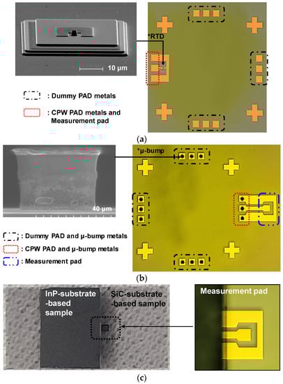 To demonstrate the mmW application capability of the flip-chip bonding technology, an InP resonant tunneling diode (RTD), which is one of the semiconductor devices operating at mmW and terahertz (THz) frequencies [,], was flip-chip-bonded for the first time with the SiC substrate and its DC, and RF performance was investigated. Figure 12a shows a fabricated InP-substrate-based sample consisting of an RTD, CPW PAD metals for the flip-chip interconnection, and dummy PAD metals functioning as supporting pillars during the bonding process. The inset shows an SEM image before the device passivation process of the fabrication RTD. The epitaxial structure and process sequence of the RTD were described elsewhere []. Figure 12b shows a fabricated SiC-substrate-based sample consisting of CPW PAD and μ-bump metals for the flip-chip interconnection, and dummy PAD and μ-bump metals functioning as supporting pillars. Figure 12c shows a microscope image after the InP-substrate-based sample was flip-chip-bonded with the SiC-substrate-based sample.