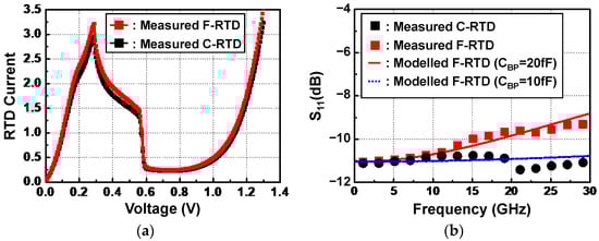 A conventional InP RTD without a flip-chip bonding interconnection (C-RTD) and an InP-to-SiC RTD with a flip-chip bonding interconnection (F-RTD) were measured by being probed at measurement pads (seen in Figure 12a,b,) respectively, with respect to the DC and RF characteristics. Figure 13a shows a DC I-V curve of the two RTD devices, which was measured with the Keithley 4200-SCS/F semiconductor characterization system and Summit 11862B probe station. The two RTDs exhibited nearly the same peak and valley voltages of 0.3 and 0.75 V, respectively. The peak and valley currents of F-RTD were 3.21 and 0.24 mA, which were approximately 9 % higher than those (2.94 and 0.22 mA) of C-RTD. This current difference was attributed to the wet-chemical etching variation in the mesa process of the two RTDs []. Figure 13b shows measured S-parameter data of the two RTDs measured with the N5225B PNA network analyzer (NA) equipment. The RTDs were biased at 0.2 V. It was observed that the S11 value of F-RTD increased compared with that of C-RTD as the frequency increased. This S11 increase was mainly attributed to the high CBP value of 20 fF. From the ADS simulation results, based on the aforementioned equivalent model of the bump, the S11 graph of F-RTD was the same as that of C-RTD when the CBP value decreased to less than 10 fF from 20 fF, as shown in Figure 13b. CBP was generated from the bump-pad region, corresponding to the region of bump-pad length of ‘a’ in Figure 1. In this work, the bump-pad length for F-RTD was as large as 80 μm, while the bump size for F-RTD (‘b’ in Figure 1) was 40 μm. Because the overflowed SnAg after the flip-chip bonding was present within 5 μm from the edge of the μ-bump metals and the alignment error of bonding equipment was within 2 μm, the bump-pad length for F-RTD could be reduced to less than 60 μm, corresponding to a CBP of 10 fF.