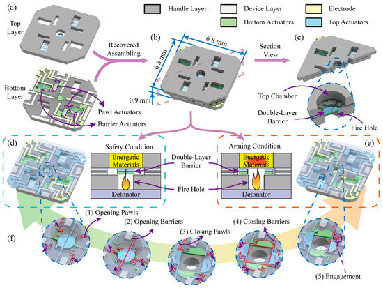 The mission of the S&A device is to allow normal detonation and prevent accidental detonation. When the S&A device is in the safety condition, the barrier will cover the fire hole and allow no signal in. If the detonator is accidentally ignited, explosive energy will be kept within the fire hole and cannot reach and detonate the energetic materials, as shown in Figure 1d. Otherwise, driven by an arming signal, the fire hole will be open and the S&A device will be switched to the arming condition. Explosive energy will be allowed to pass through the S&A device and detonate the energetic materials, as shown in Figure 1e.