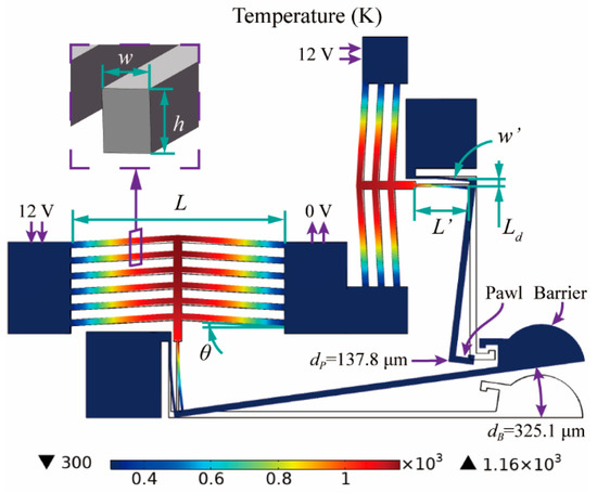 where d and d’ is the displacement of the actuator with soft lever and without soft lever, ky is the elastic coefficient of the actuator, E is the Young’s modulus of silicon, I is the moment of inertia, I = hw’3/12, A is the cross-sectional area of the actuator, α is the thermal expansion coefficient of silicon, and T is the average temperature of the beam. The specific geometrical parameters of the soft lever mechanism are shown in Table 2 and presented in Figure 2. According to calculations, when the applied voltage (V) is set to 12 V, the displacement of the barrier actuators is 9.03 μm without the soft lever mechanism, and the maximum temperature is 1143 K. After integrating the soft lever mechanism, the displacement reduces from 9.03 μm to 7.75 μm, and the barrier’s displacement is enlarged to 367.5 μm. Similarly, the displacement of the pawl actuators reduces from 8.17 μm to 6.42 μm, and the maximum temperature is 1144 K. After being enlarged, the pawl’s displacement is 149.4 μm.