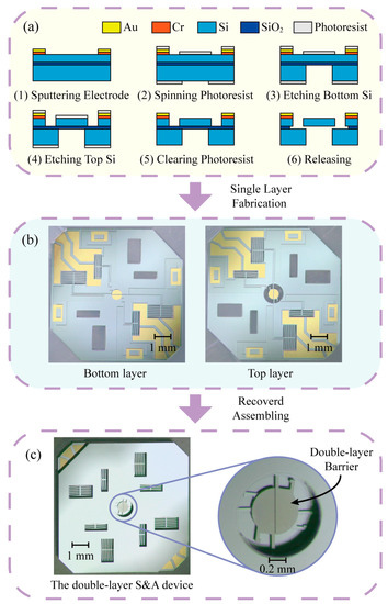 SOI wafers (50 μm device layer, 3 μm buried layer, 400 μm handle layer) are used to fabricate movable structures in the S&A device. The movable components are placed on the device layer with chambers in the handle layer for releasing moving components. The fabrication process is shown in Figure 3a, as follows: (1) Sputtering 50 nm Cr and 300 nm Au on the top of the SOI as the electrodes; (2) Spinning photoresist on both sides for masking in the Deep Reactive Ion Etching (DRIE) process; (3) DRIE process etches the bottom silicon with a depth of 400 μm to release moving parts; (4) DRIE process etches the top silicon with a depth of 50 μm; (5) Clearing the photoresist; (6) Using HF wet etching to etch the SiO2 for the release process, and separate the movable parts of the top silicon and the fixed parts of the bottom silicon. The two layers of the S&A device can be fabricated in one layer of the SOI wafer, as shown in Figure 3b. With the top layer covering the bottom one, the two layers are connected by epoxy resin glue, and the double-layer barrier is formed in the center of the S&A device, as shown in Figure 3c.