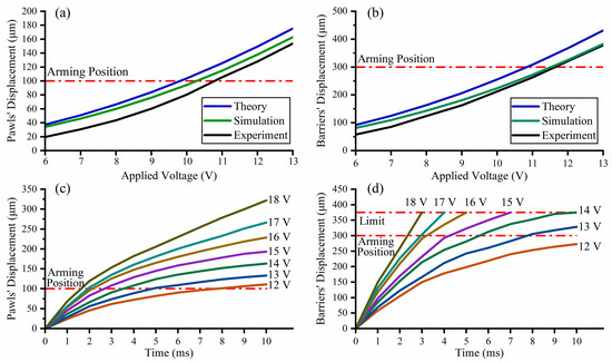 The key indicators of the actuator are static performance and dynamic performance. According to the driving principle, the displacement of the electrothermal actuator is directly determined by the applied voltage, and the displacement when the applied voltage lasts for 20 ms is chosen as the static performance of the actuator, and the response process when the applied voltage lasts for 10 ms is chosen as the dynamic performance. In static performance test, the displacement of the barriers and the pawls are recorded by a high-speed camera (1000 fps) from 6 V to 13 V, and test results are shown in Figure 4a,b. Only when the displacement of the barriers and the pawls are all larger than the arming position can the S&A device switch to the arming condition. Thus, the minimum applied voltage is 12 V with the barriers’ displacement of 321.4 μm (theoretical error of 14%; simulation error of 1.2%), and the pawls’ displacement of 127.8 μm (theoretical error of 17%; simulation error of 7.8%). The simulation result is closer to the test result due to its more specific thermal conduction model.