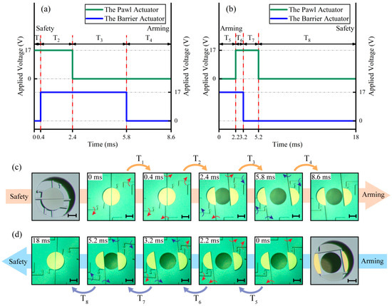 The relationship between the applied voltage and the operation process: (a) The safety to arming process; (b) The arming to safety process; (c) The safety to arming process; (d) The arming to safety process.