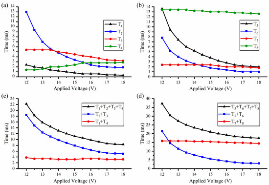 The A-S process is similar to the S-A process, and the test results are shown in Figure 6b,d. T5 obviously decreases from 13.6 ms to 2 ms, and T6 decreases from 8 ms to 1 ms, which is consistent with the test results of dynamic performance. With the decrease of T5 and T6, T7 also slightly decreases from 2.4 ms to 1.8 ms, and T8 decreases from 13.4 ms to 12.6 ms. Therefore, the total time of the A-S process (T5 + T6 + T7 + T8) also obviously decreases from 37.4 ms to 17.4 ms, the trend of which is basically consistent with the barrier-driven time (T5 + T6). When the applied voltage is 18 V, the cooling process (T7 + T8) is 14.4 ms (82.8% of the total time). Thus, the A-S process is also hardly faster with the further increase of the applied voltage.