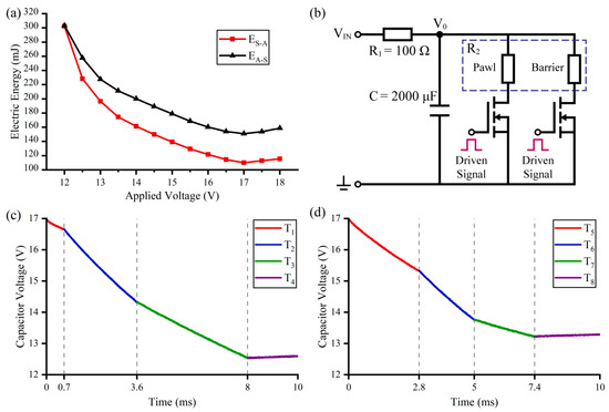 Here, ES–A is the electric energy required in the S–A process. EA–S is the electric energy required in the A–S process. VIN is the applied voltage. RP and RB are the resistances of the pawl actuators and the barrier actuators. The calculation results are shown in Figure 7a. Because the two processes are hardly faster with the further increase of the applied voltage, both ES–A and EA–S have a minimum value when the applied voltage is set to 17 V, and EA–S is always less than ES–A.