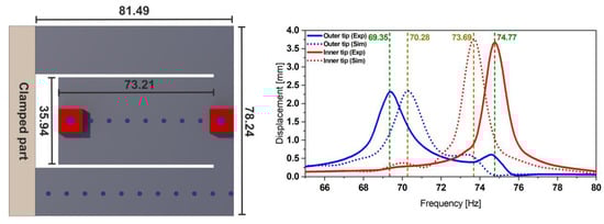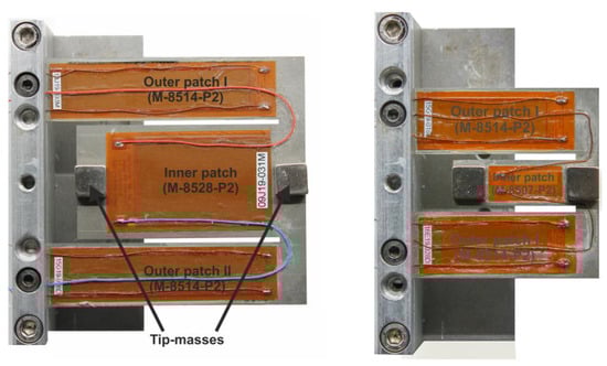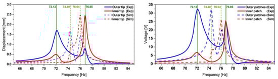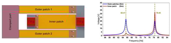 The mechanical resonator design belongs to the coupled resonators category. It consists of two identical 80 mm long beams (referred to as outer beams), mechanically coupled through a common end to a 60 mm long inner beam which extends, in turn, towards the fixed end []. It incorporates tip-masses of identical weight m = 7.6 g. The model integrates encapsulated Macro Fiber CompositeTM (MFC) piezoelectric patches, supplied by SMART MATERIAL Corp. (outer beams: two 60 × 7 × 0.18 mm3 M-8507-P2 patches; inner beam: 48 × 14 × 0.18 mm3 M-8514-P2 patch) [], as depicted in Figure 2. The deformation of the piezoelectric layers causes a surface charge distribution and, consequently, a voltage across the patch electrodes. In the previous works [,,], we validated our FE model results, represented in Figure 2, through a comparison of the simulation with the characterization results.