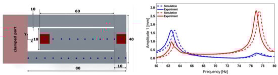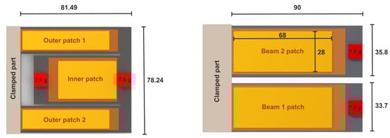 The experimentally observed resonance frequencies, f1 Exp = 66.17 and f2 Exp = 78.42 Hz, match the simulation results, f1 Sim = 64.30 and f2 Sim = 77.50 Hz. This FE model considers the adhesive layer as a material of high compliance (E = 450 kPa) and implements a mode-dependent damping ratio. Furthermore, the slight frequency deviation (up to 1.2%) between the model and the experimental results is caused by the MFC patch geometry simplifications and the implemented glue properties—as obtained from the supplier’s datasheet—as well as the homogeneity of the glue layer thickness. The limited reproducibility of the patch attachment and tip-masses positions constitutes an additional reason for this discrepancy.