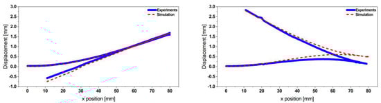 Following the same procedure as in Section 2.2.1, we propose to experimentally characterize the mode shapes of the steel-based resonator and obtain the displacement transfer functions (see Figure 14). The results presented in Figure 14 show a good match between the experimental and the simulation data. A slight frequency shift and a discrepancy between the displacement amplitudes are caused by the uncertainty of the material properties and measurement equipment systematic errors as well as the mode-dependent damping ratio used in the FE model.