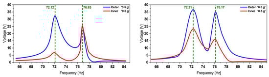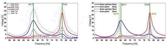 The harvester was excited at acceleration amplitudes of 0.2, 0.5, and 1.0 g. The results presented in Figure 5 demonstrate the dual-frequency feature of the harvester. In contrast to [], where we used an adhesive tape, here we employed epoxy-glue to attach the patches. This enhances strain transfer and yields higher voltages.