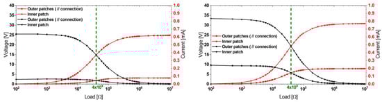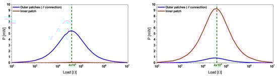 Experimental load-matching approach followed to obtain the optimum load values of the outer and inner patches of the reference design harvester at the first (left) and the second (right) modes.