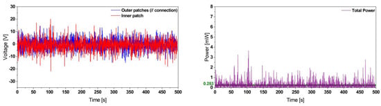 Furthermore, we tested the performance of our optimized design under a under white noise excitation in the frequency range [50, 100] Hz and providing a power density of 0.005 g2/Hz. The voltage output is shown in Figure 17. The presented results demonstrate that our system is able to deliver a net power of 944 µW at the random excitation used for this test.