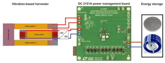 Piezoelectric energy harvesting bears the risk of generating voltage levels which exceed the range compatible with electronic circuits and related components, such as microcontrollers or power storage modules. Consequently, a voltage conditioning circuit is required for a reliable operation. Therefore, we evaluated the harvester’s power delivery using the power management board Analog Devices 2151A (see Figure 9), which also integrates battery charging capabilities [].