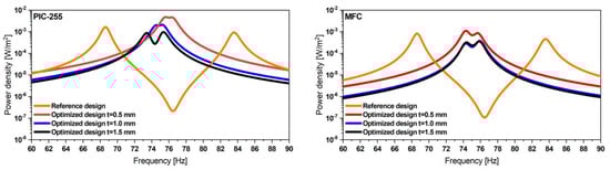 Estimated power density of the proposed optimized designs considering PIC-255 (left) and MFC patches (right), outperforming the initial reference designs in both cases. The closely spaced resonance frequencies result in an extended operative bandwidth at comparable power levels.