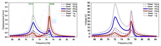 We excited the harvester at several excitation levels up to 0.5 g. The power delivery to a matched load was found to be 5.6 and 10.1 mW for the outer and inner beams, respectively, as shown in Figure 7.