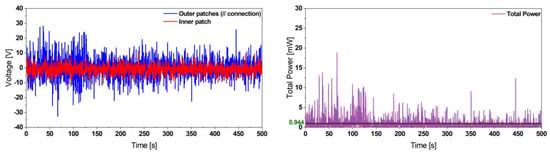 The board incorporates the LTC3331 chip, which provides a regulated voltage from various energy harvesting sources. The conditioning circuitry consists of an integrated low-loss full-wave bridge rectifier and a buck converter. The rechargeable coin-cell battery powers a buck-boost converter capable of providing voltages between 1.8 and 5.0 V. Depending on the power available from the harvester and the power required by the application, the power is either supplied by the harvester or the battery. An internal prioritizer selects the suitable power source. If the harvesting source meets the power requirement needed for an autonomous operation of the system, the buck regulator is active, and the buck-boost converter is off and vice versa. The outer patches, which are electrically connected in parallel, are directly connected to the AC input of the board. Therefore, an additional bridge rectifier (FS B500-C1500 provided by DIOTEC Semiconductor AG, Heitersheim, Germany) is required, to be connected to the inner patch prior to the DC input of the power management board, since the latter provides only a single AC input.