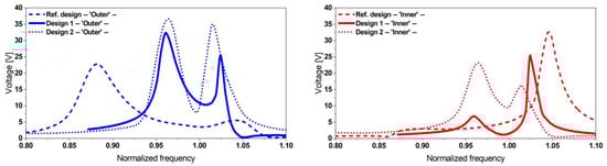 The data in Table 6 summarize the performances between the proposed optimized designs and the reference design. They clearly demonstrate that the optimized designs deliver higher power output. They also provide a wider active bandwidth, as demonstrated in Figure 18. The so-called ‘active bandwidth’ in our case represents the frequency range, where the harvester’s output voltage exceeds the minimum operating voltage of the power management board (5 V). For the sake of a fair comparison, we propose to normalize the frequency spacing to a central frequency f0 = 75 Hz.