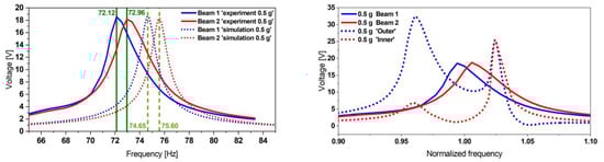 The experimental data were compared to the simulation results (see Figure 16). By matching the damping ratios, we could fit the simulated voltage amplitude to the experimental value of the optimized harvester with a remaining relative deviation of 0.5%. However, we additionally observed on three samples that the experimental frequency spacing was 2.9 times broader than the one expected in simulations.