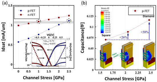 As clearly seen in Figure 1a, p-FET Idsat is only around half of n-FET Idsat without channel stress, but p-FET has much higher stress sensitivity than n-FET. As reported in Ref. [6], the channel would inherit 450–950 MPa tensile stress from the release of the sacrificial SiGe layer due to stress transfer. This favors n-FET and makes it very crucial to have higher channel stress in p-FET. As shown in the inset of Figure 1a, good N/P current matching could be realized with n-FET @ 1 GPa tensile stress and p-FET @ 2.5 GPa compressive stress, indicating it is extremely important to engineer the channel stress well, especially for p-FET.