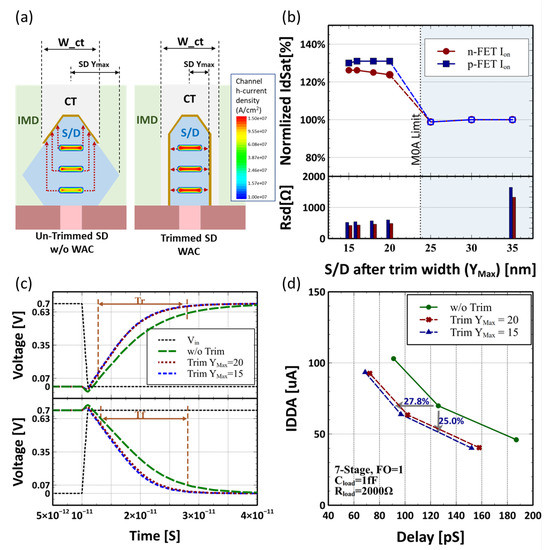 (a) Current from bottom NS of trimmed S/D and WAC has much a shorter distance to contact compared to an un-trimmed case, resulting in a more equally distributed current between all three nanosheets and better efficiency; (b) ion performance and extracted Rsd at varied S/D trimming position; (c) switch delay of an inverter on a fixed load of 1fF. Both Tr and Tf of NS-FETs reduce with S/D trimming; (d) power–delay curve of a constructed 7-stage ring oscillator.