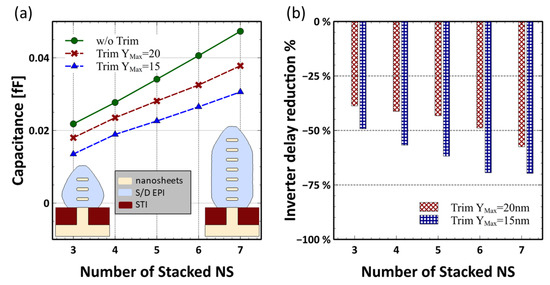 One of the most promising advantages of GAA NS-FETs technology is the vertical scalability [2]. However, as the stacking layers increase, the epitaxy S/D also becomes bigger. This will cause even higher access resistance and bigger parasitic capacitance, degrading the device performance [12]. As shown in Figure 4a, with the proposed S/D trimming scheme, the capacitance increase with more stacking NS becomes much slower, and the S/D after trimming can be adjusted to embrace the WAC, thus further reducing the S/D parasitic Resistance. As demonstrated in Figure 4b, as the number of stacked nanosheets increases, more benefits could be gained from the S/D trimming regarding the inverter delay. This may provide a very promising solution for S/D parasitic suppression and GAA technology extension beyond the 3 nm node.