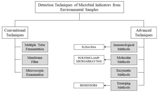 Traditional approaches depend on metabolic activity reactions or a growing response in an adequate substratum after a sufficient incubation period. Some of the standard investigation approaches are multiple tube fermentation (MTF), membrane filter (MF), and microscopic techniques (Figure 1).