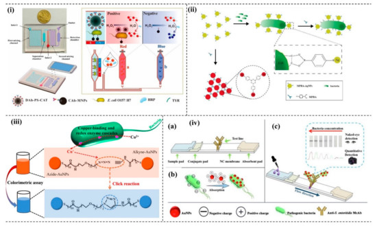 Metallic nanomaterials-based pathogen detection system: (i) E. coli O157:H7 is detected by tuning the optical property of AuNPs by using tyramine as a crosslinking agent in microfluidic platform. Reprinted with permission from Ref. [97]. Copyright 2019 Elsevier. (ii) Colorimetric detection of bacteria explores the aggregation and inhibition of aggregation of MPBA-AgNPs. Reprinted with permission from Ref. [98]. Copyright 2018 Elsevier. (iii) Aggregation of AuNPs is instructed by bacteria to undergo click chemistry and triggered in the presence of Cu+. Reprinted with permission from Ref. [99]. Copyright 2019 American Chemical Society. (iv) Schematic representation of the colorimetric assay of S. enteritidis based on positively charged AuNPs using lateral flow technology, (a) test strip structure, (b) interaction of (+) AuNPs- (−) S. enteritidis mechanism, (c) colorimetric and quantitative detection of S. enteritidis [100].