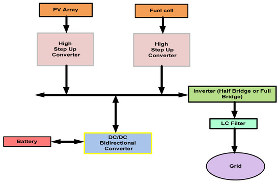 Recently, there has been a continuous increase in environmental issues. As a result, retardations have occurred in the power generation based on fossil fuel [1,2]. In addition, the rapid growth of energy consumption across the globe has increased numerous renewable energy-based power generation systems, control algorithms, smart grids, advanced energy conversion, hybrid energy storage systems, and management systems. These systems require advanced power converters to convert the voltage efficiently; as a result, the power generation based on renewable energy sources will be enhanced [3,4]. Therefore, recently, power generation through improved control techniques and better power switching devices is one of the hot research areas [5,6]. One of the main concerns is that renewable energy sources have a low Direct Current (DC) output voltage, such as fuel cell stacks and photovoltaic arrays. It is important to increase the range of voltage to the next level, e.g., 380 V DC in the case of the inverter (full bridge) and 760.00 V-DC in the case of the inverter (half bridge) for yielding 220 V AC output to be interfaced with a grid-connected power system of 220 V AC [7]. DC-to-DC converter development for delivering a high step-up voltage conversion with a low switch stress and high efficiency is one of the key challenges in advancing renewable energy systems [8]. Figure 1 shows the block diagram of a single-phase hybrid renewable energy grid-connected system. In general, such a system consists of a photovoltaic (PV) array, fuel cell stack, batteries, DC-to-DC converters, and inverter [9]. Those DC-to-DC converters with high step-up conversion ratios are needed to interface low-voltage outputs of fuel cell stacks and photovoltaic arrays, typically 22–48 V, with a relatively high-voltage (200+ V) DC link for supplying standalone or grid-connected AC loads through an inverter [10].