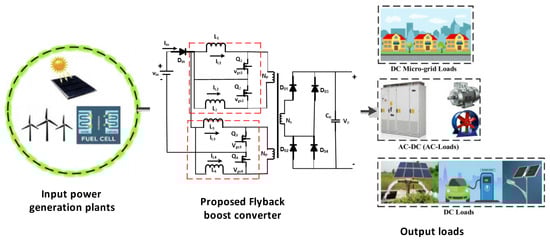 The performance and investigation of DC–DC converters, i.e., interleaved boost converter, Flyback-based converter, and simple boost converter, are briefly demonstrated as shown in Figure 2. The analysis of DC–DC converters means to derive expressions for the inductor currents, output, and capacitor voltages of the targeted converters by applying two different techniques, i.e., capacitor charge balance and inductor volt–second balance [26]. Flyback-based and interleaved boost converters were analyzed for different switching modes. Two input levels, an associated transformer, current-fed input circuits, and a subsidiary rectifier bridge make up the converter. Each input-stage course has two control switches (power) and two inductors. To allow for the overlapping process, the values of Q1 and Q4 switches should be higher than 0.5 in order to achieve smooth conversions. These can be mathematically expressed [27] as the following.