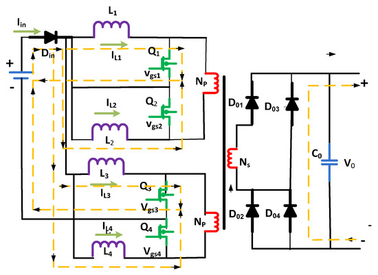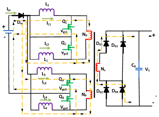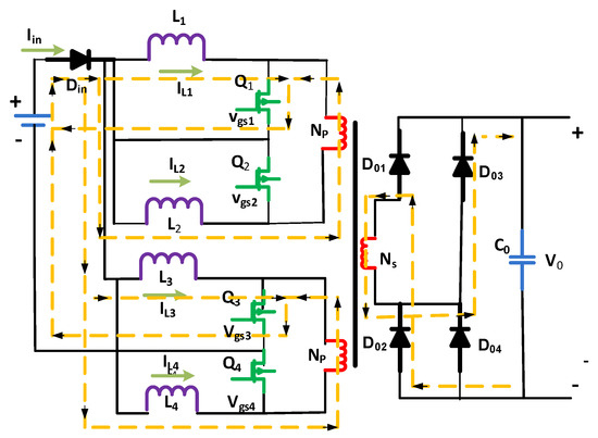 MOSFETs Q1 and Q3 are turned on in Mode 1, whereas Q2 and Q4 are off. MOSFETs Q1 and Q3 carry the currents inductors and , respectively. As Figure 3 depicts, the currents of inductors and drift into the windings of the transformer, i.e., first and second primary, respectively. The following equations give the voltage of inductors , , , and as well as the current of inductors , , , and [28,29,30]: